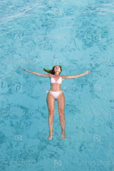 Девушка в белом купальнике лежит на воде, раскинув руки