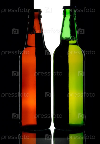 Две бутылки темного и светлого пива на черно-белом фоне