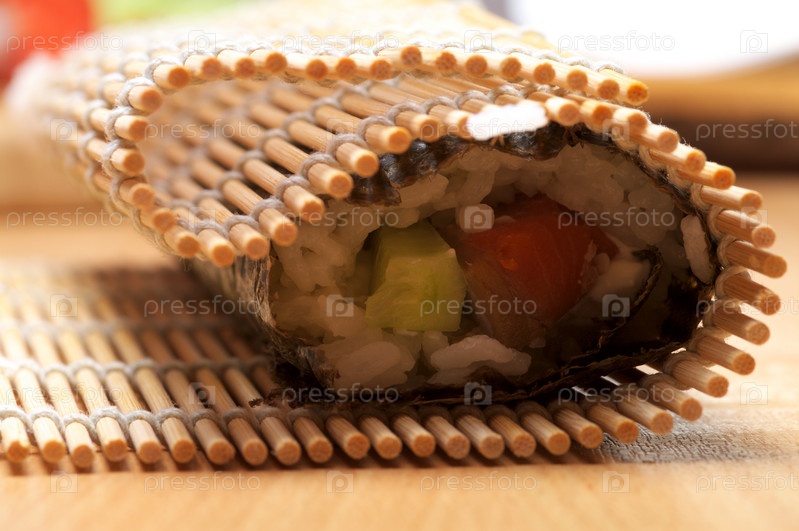 Приготовление суши, ролл в бамбуковой циновке