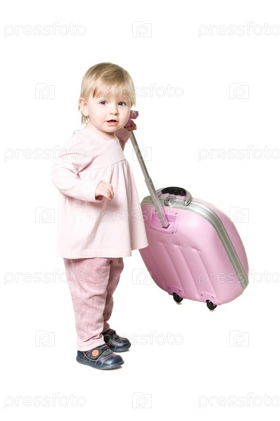 Маленькая девочка с чемоданом на белом фоне