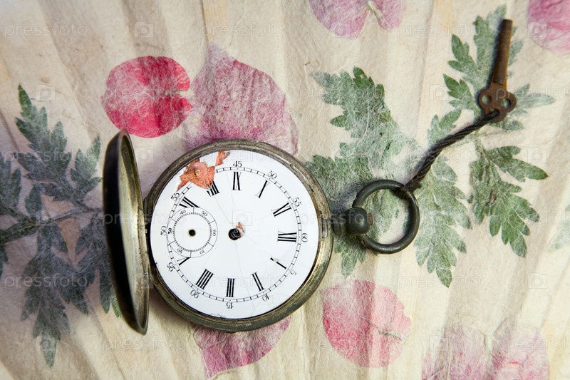 Старинные карманные часы на бумаге ручной работы с листьями