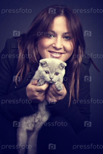 Студийный портрет молодой брюнетки с кошкой в руках на черном фоне