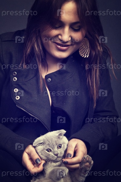 Студийный портрет молодой брюнетки с кошкой на черном фоне