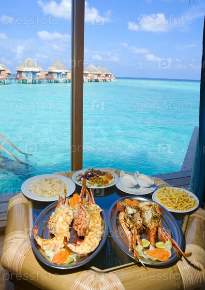 Тарелки с лобстером на столе у окна с видом на океан, Мальдивы
