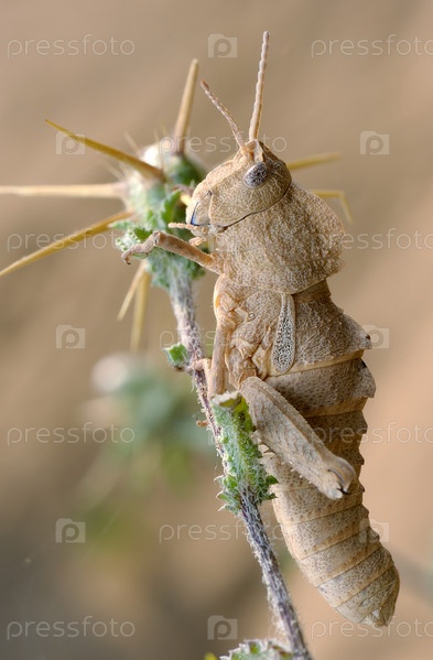 Кузнечик на колючке крупным планом