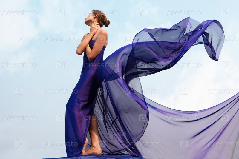 Женщина в синей шелковой ткани на фоне неба