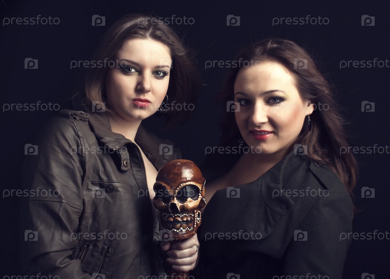 Две симпатичные девушки с деревянным черепом в руках позируют на черном фоне