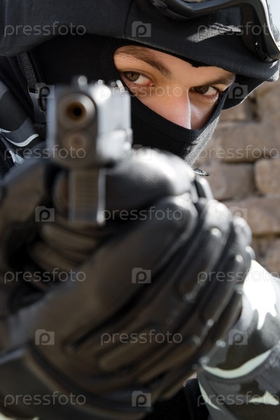 Человек в военной форме и полной боевой готовности держит пистолет