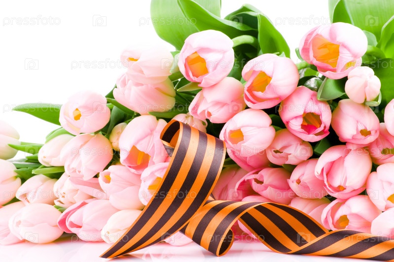 Лента в память о Великой Отечественной войне и тюльпаны