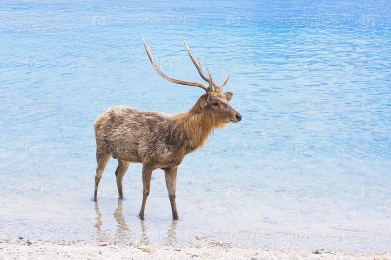 Олень с большими рогами на берегу океана