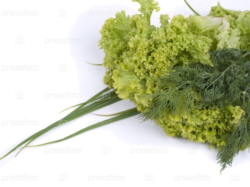 Салат, лук и укроп на белом фоне