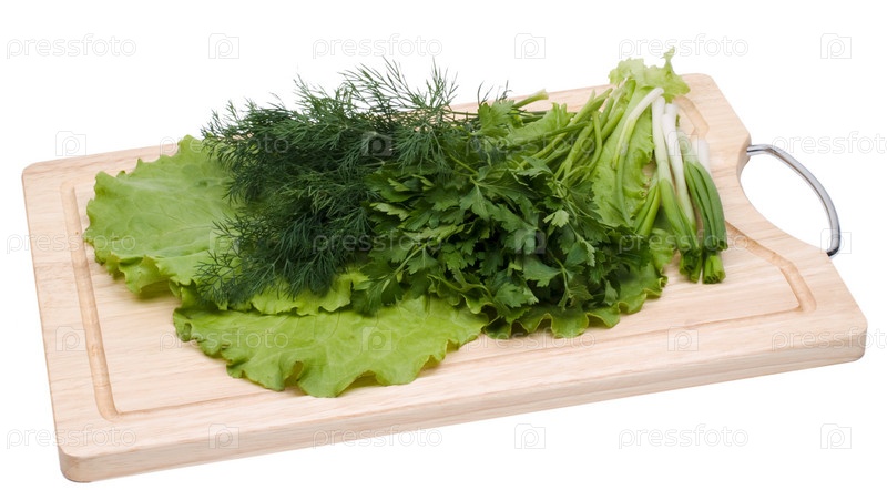 Салат, укроп и петрушка на разделочной доске на белом фоне