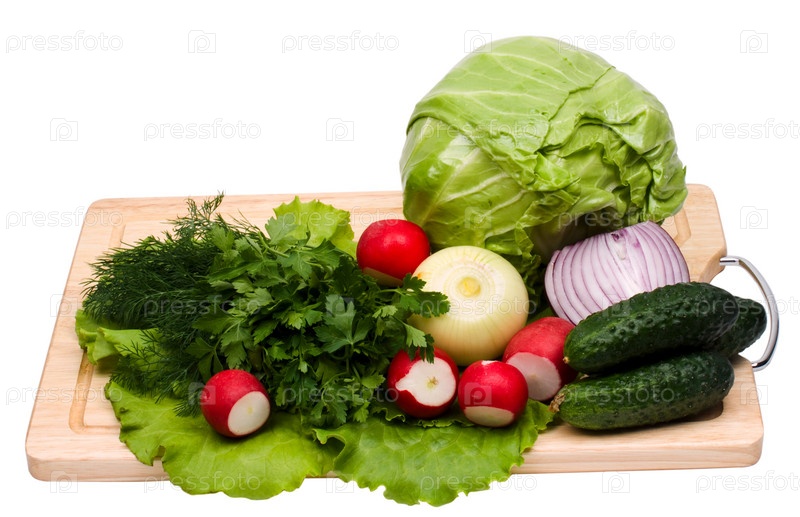 Свежие овощи на разделочной доске на белом фоне