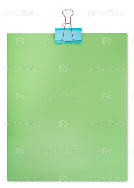 Большая сцепка и лист зеленой бумаги, изолированные на белом фоне