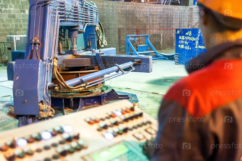 Рабочий управляет процессом изготовления бетонного блока