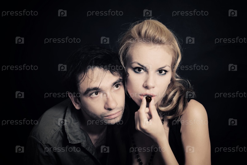 Молодой мужчина и женщина с шоколадной конфетой
