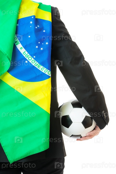 Футбольный мяч в руке и бразильский флаг