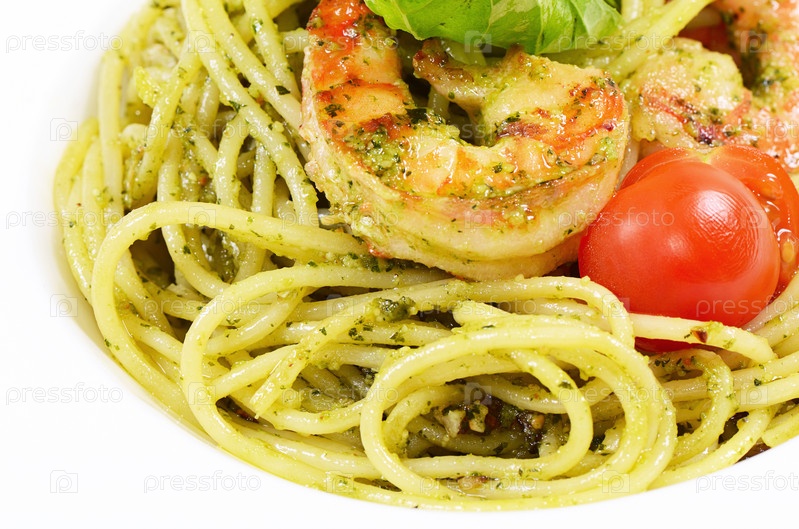 Спагетти с соусом песто и креветками