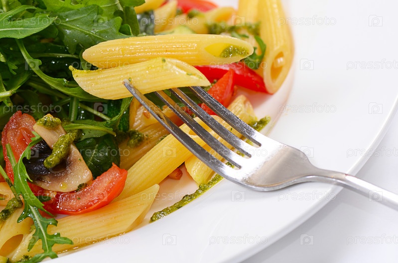 Макароны с овощами и салатом