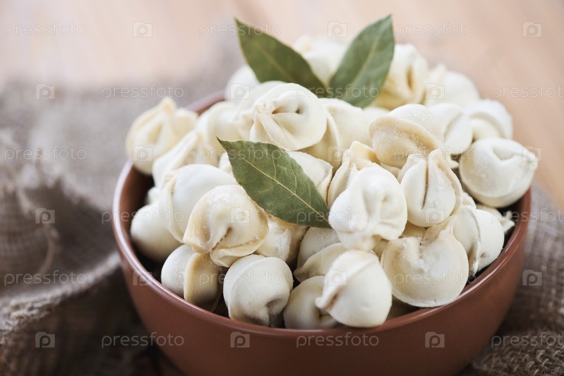Сырые пельмени и сухой лавровый лист в чашке