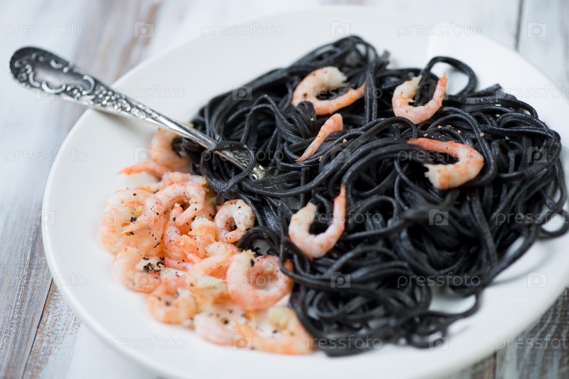 Черные тальятелле с вареными креветками