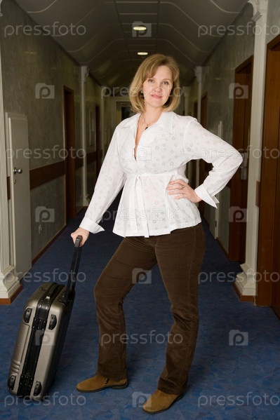 Беременная женщина с чемоданом в коридоре