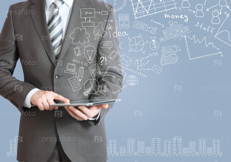 Мужчина с планшетом в руках и бизнес-эскизы