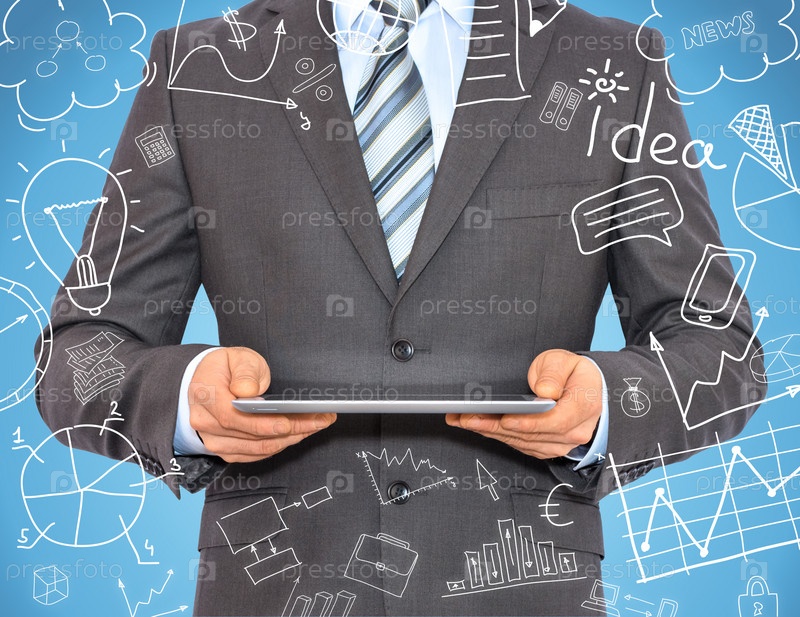 Мужчина с планшетом в руках и бизнес-эскизы