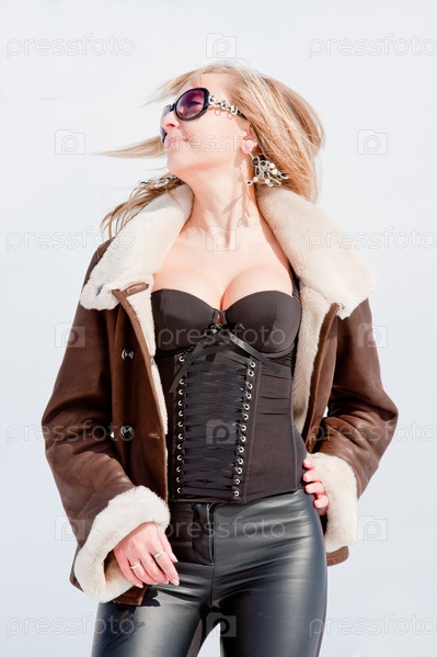 Стильная молодая блондинка в дубленке на фоне неба