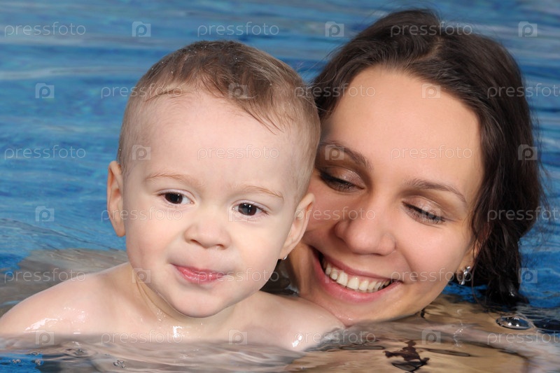 Молоденькая мама занимается с сыном в бассейне