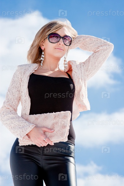 Молодая женщина на фоне голубого неба