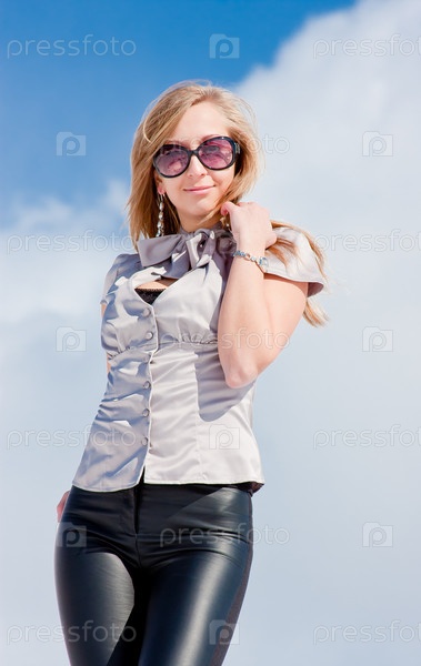 Молодая женщина на фоне голубого неба