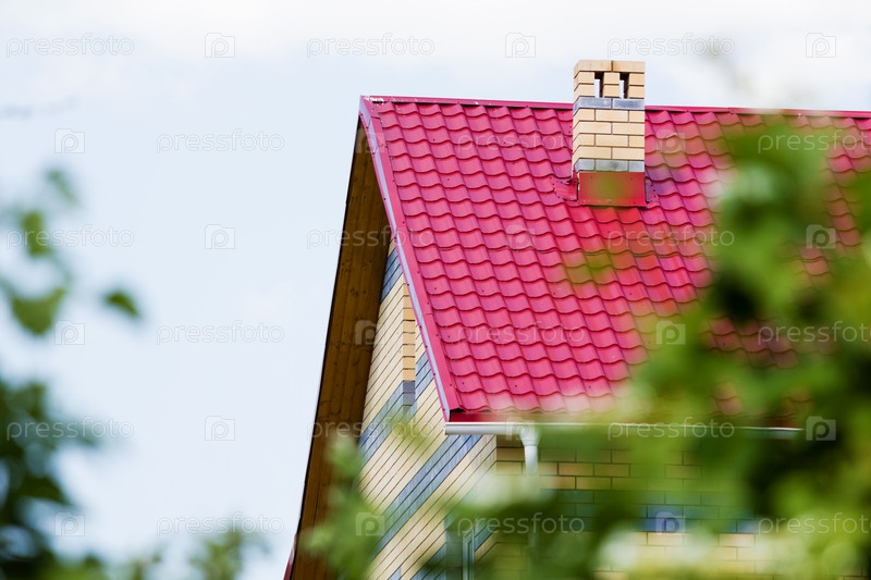 Красная крыша дома на фоне летнего неба