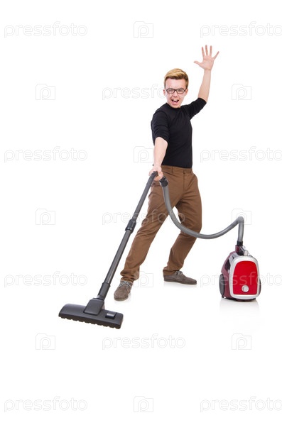 Забавный человек с пылесосом