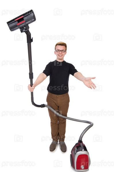 Забавный человек с пылесосом