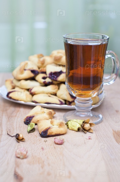 Кружка чая со свежей выпечкой на деревянном столе