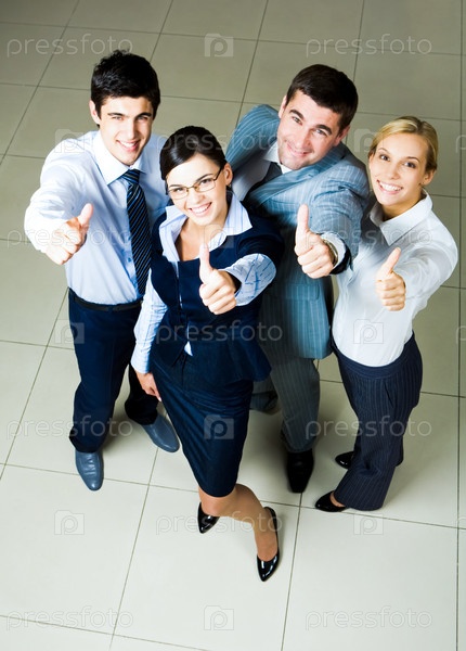 Изображение четырех успешных сотрудников, улыбающихся перед камерой и показывающих большие пальцы вверх