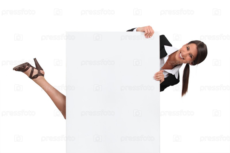 Женщина прячется за баннером