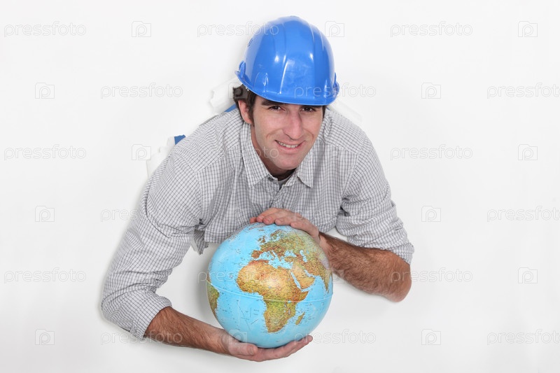 Строитель держит на глобус
