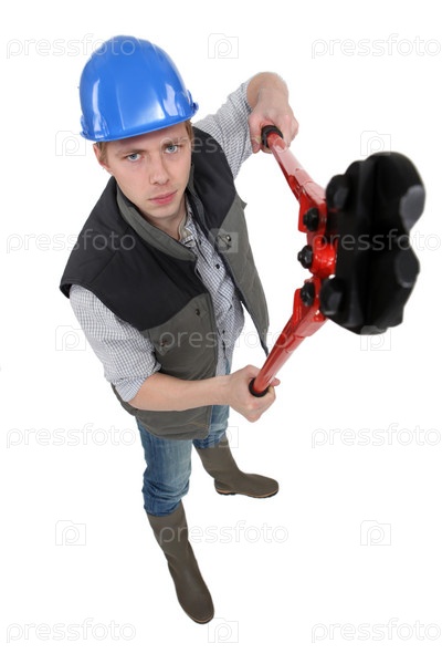 Ремесленник держит гаечный ключ
