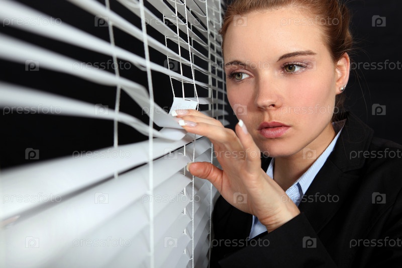 Женщина смотрит через жалюзи