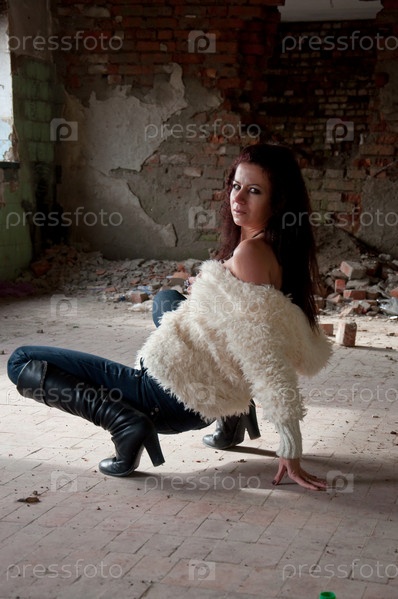 Девушка позирует в разрушенном доме
