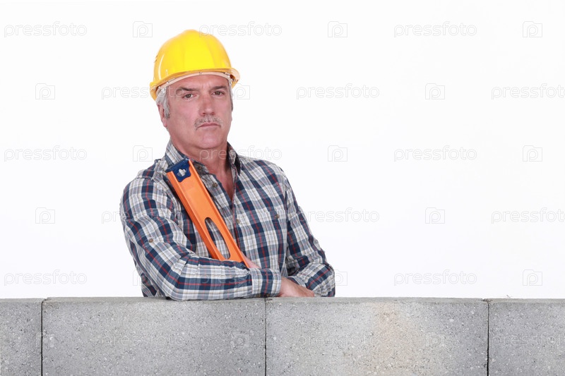 Каменщик с уровнем у стены