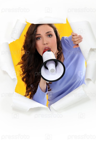 Молодая женщина кричит в рупор