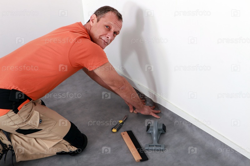 Мужчина укладывает ковролин в углу