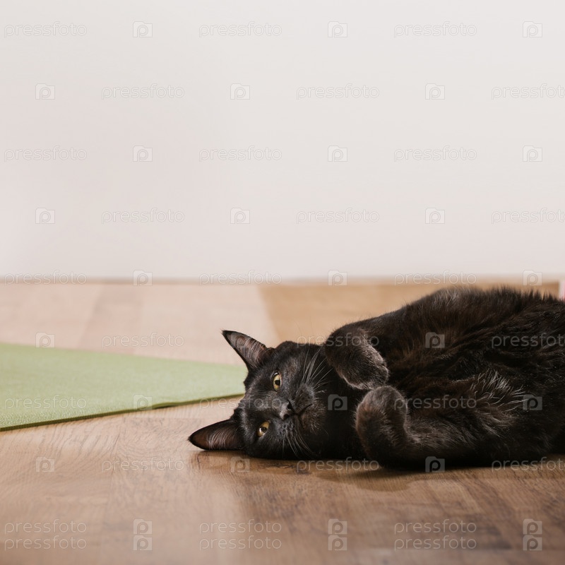 Черная кошка лежит на полу