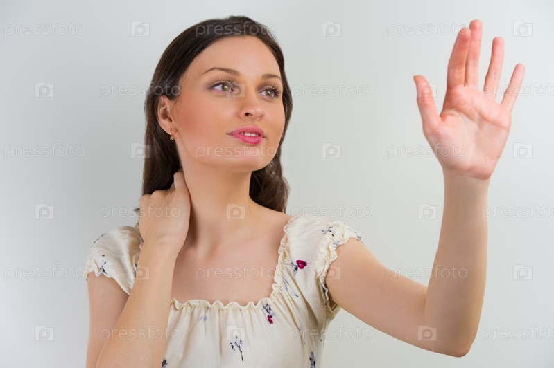 Женщина прикасается к виртуальной кнопке