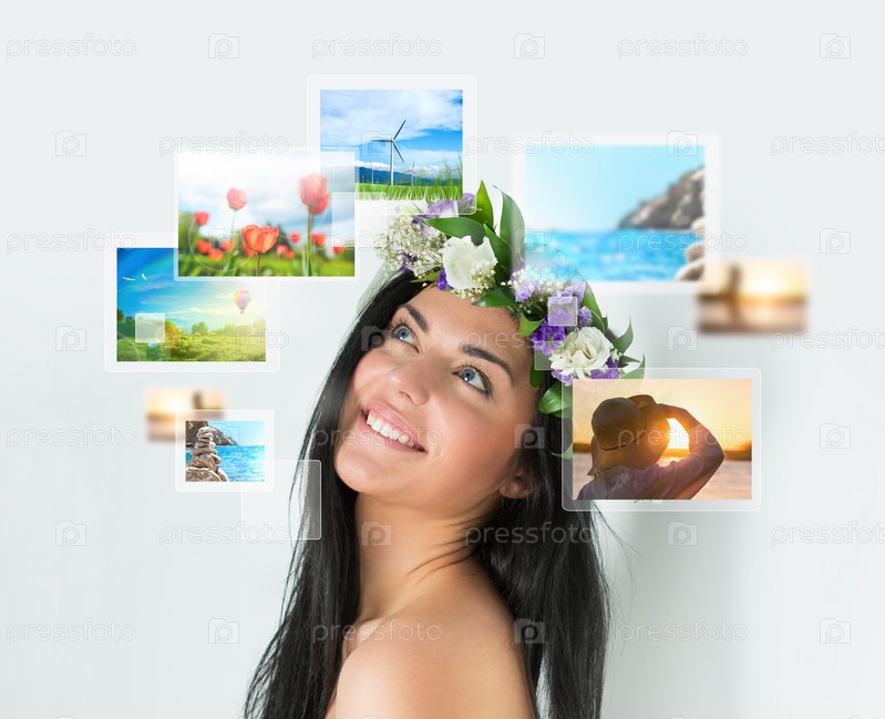 Портрет молодой женщины и фотографии в социальной сети