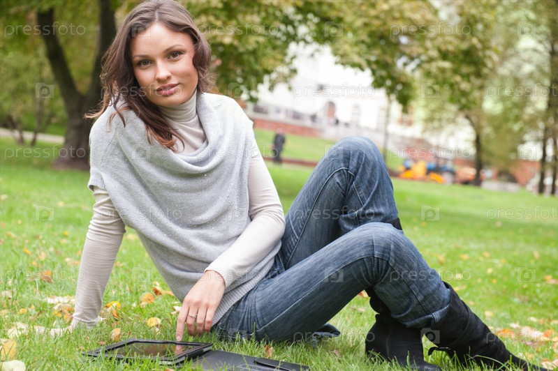 Молодая женщина с компьютером в парке