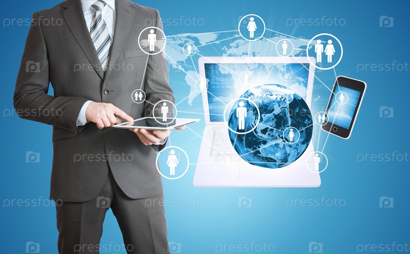 Бизнесмен, глобус и электроника